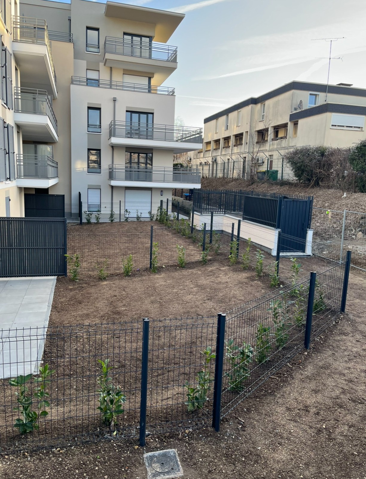 Pour ce chantier, nos équipes ont assuré la fourniture et l’installation d’un grillage rigide anthracite, complété par des lames pare-vue sur les zones de terrasse. Cette combinaison garantit robustesse, longévité et confidentialité, tout en s’intégrant parfaitement au style moderne des habitations.