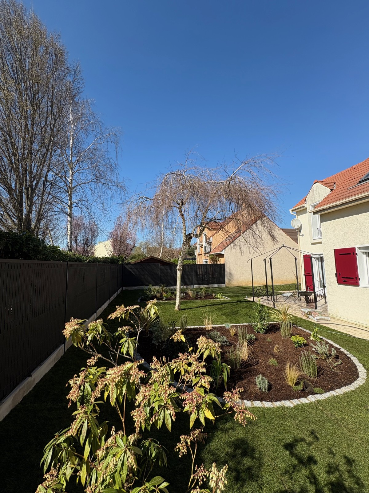 SYLVATICA assure la réalisation d’un jardin à Villemoisson-Sur-Orge, en combinant sécurité et esthétisme. Pose de clôture rigide avec occultations en composite, création de massifs avec bordures en pavés granit, installation de gazon en rouleaux : nous aménageons votre espace extérieur avec expertise. Contactez-nous pour sublimer votre jardin !