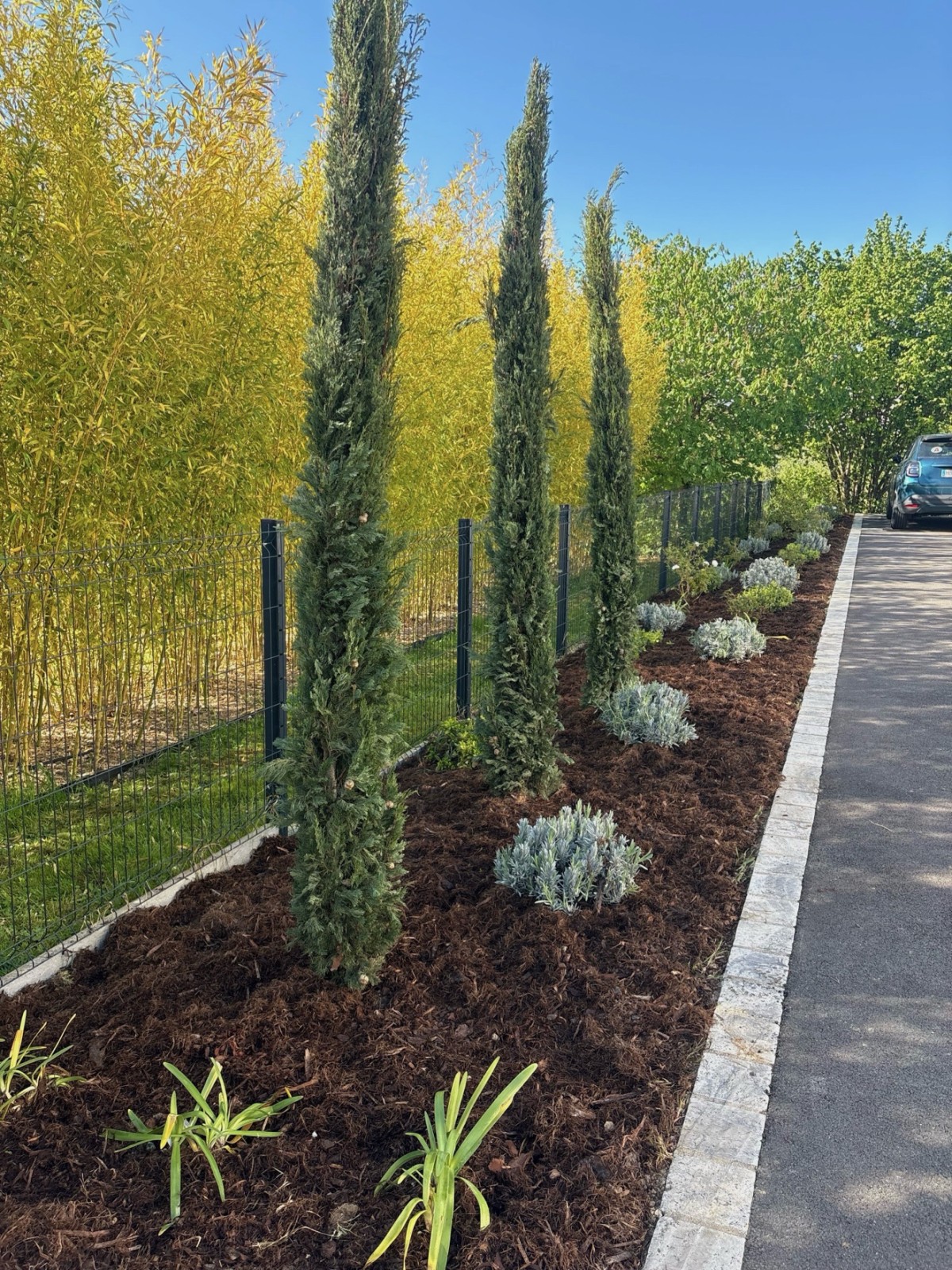 SYLVATICA a réalisé un massif paysager à Nemours avec cyprès de Provence, lavande, agapanthe et pittosporum tobira. Grâce à un paillage naturel, cet aménagement est esthétique, durable et facile d’entretien. Une solution idéale pour structurer et embellir votre jardin.