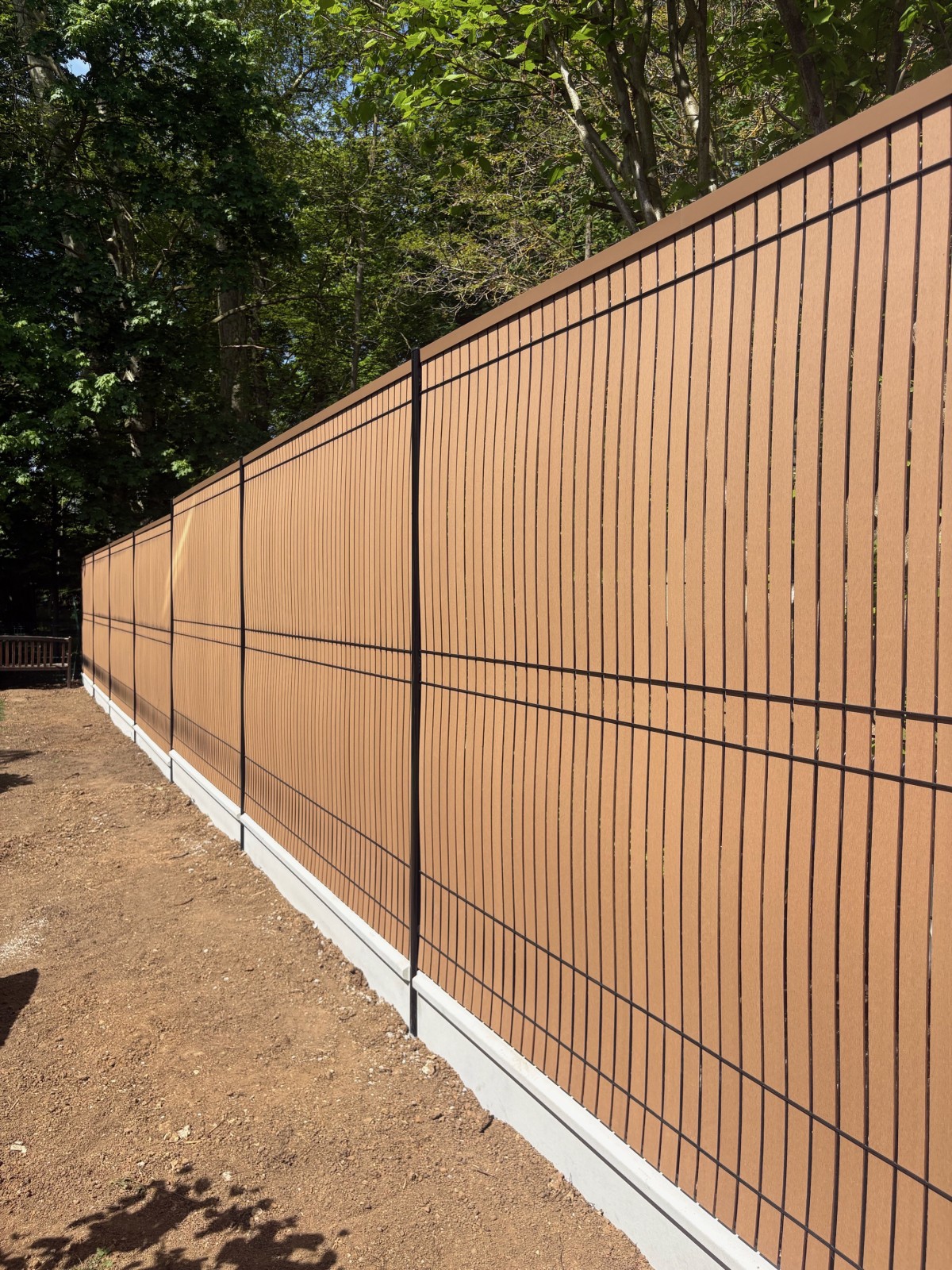 SYLVATICA a réalisé une clôture rigide avec occultants en composite à Etiolles, Essonne (91) avec plaques de soubassement. Cette solution assure sécurité, intimité et durabilité, tout en offrant un rendu esthétique moderne. Une installation professionnelle adaptée aux contraintes du terrain.